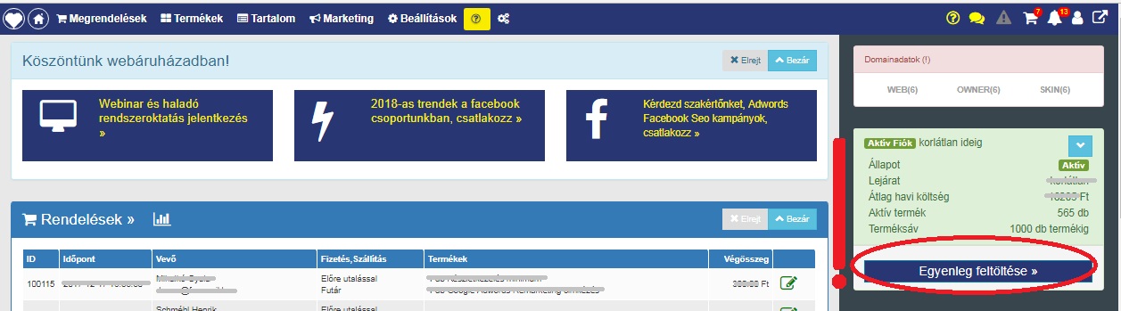 A webáruház indításához minimum az 1. havi díjat kell befizetni, ennyit kell az egyenlegre feltölteni.