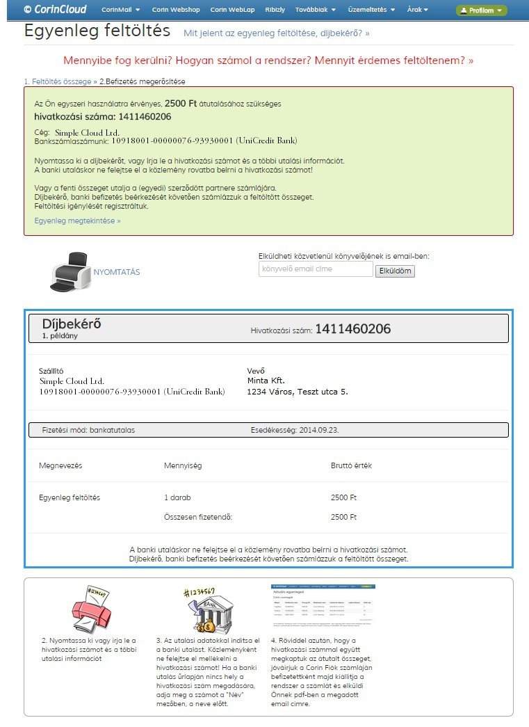 A rendszer elkészíti a díjbekérő számlát a megadott feltöltési összegről, melyet elküldhetsz azonnal a könyvelésre (az utalás ügyintézőjének), kinyomtathatsz, vagy azonnal intézheted az átutalást saját bankodba belépve.