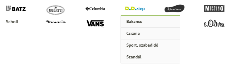 Leírás: A márka logó jól felhívja magára a figyelmet és az egeret felé húzva az adott márkán belüli összes termékkategória lenyílik, melyek közül a vevő könnyedén kiválaszthatja, hogy az adott márka milyen termékei között szeretne böngészni.