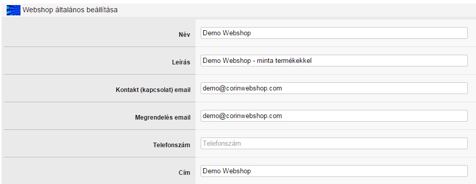 Beállítások: a webshop (bolt) beállításai: fizetési, szállítási beállítások, termék és kosár (megrendelőlap) beállításai