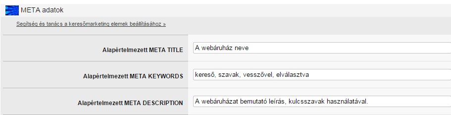 Az admin felületen a Beállítások -> SEO funkciók -> SEO beállítások menüpontban teheti ezt meg. A webáruház alap SEO adatait tudja itt megadni, az áruház nevét, keresőszavakat, a webáruház leírását.
