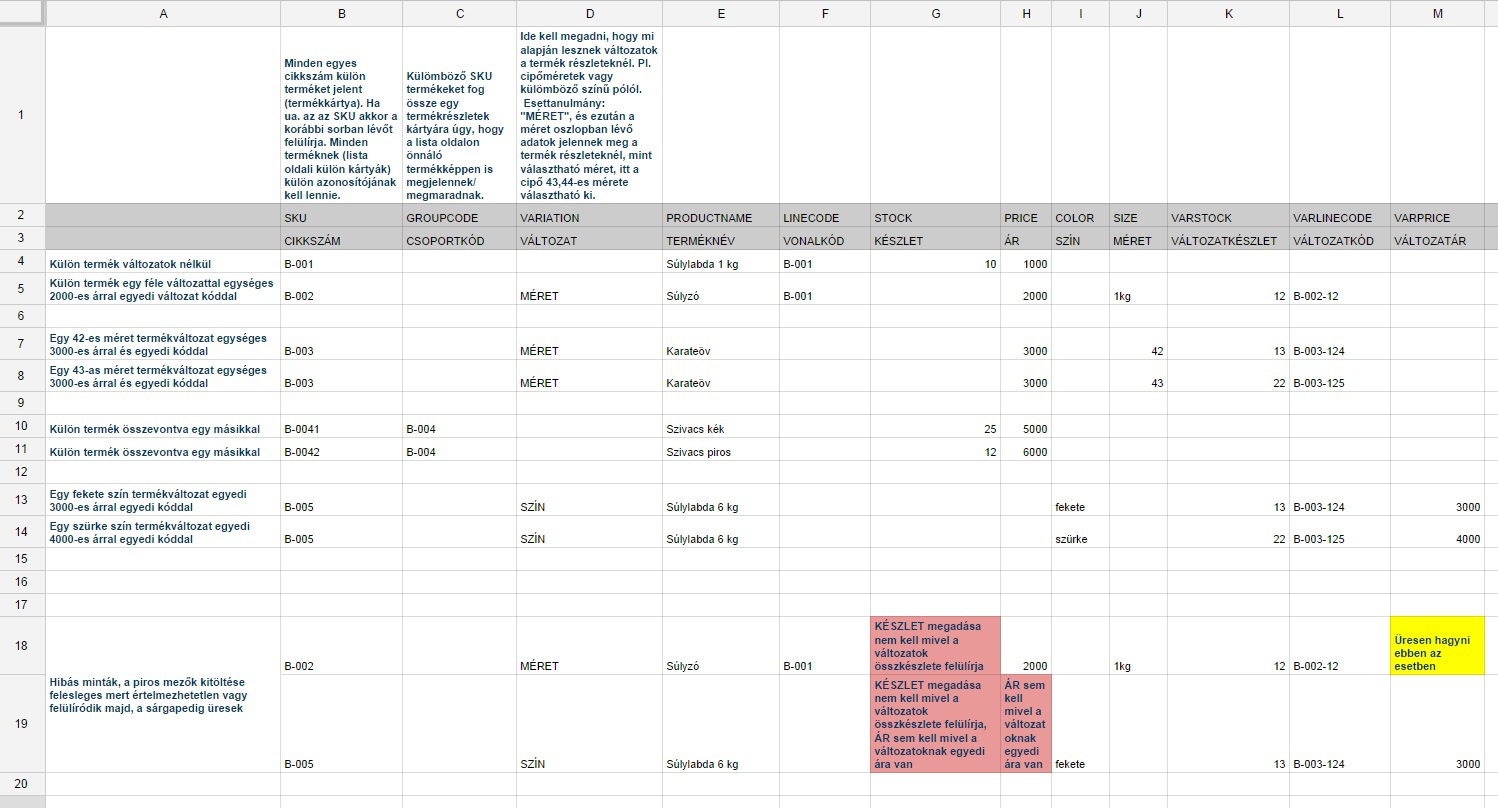 Ha ugyanazon termékhez több méret vagy színváltozatot töltünk fel, és emiatt több sorban adjuk meg az adatokat, akkor nagyon fontos, hogy minden ilyen sornál a SKU értékének meg kell egyeznie, mert csak így tudja összekapcsolni a rendszer egy termékké. (Kötelező)